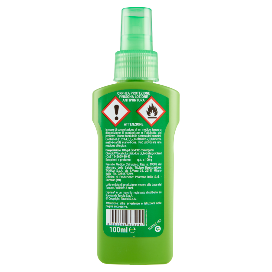 Orphea Protezione Persona Lozione Antipuntura protegge efficacemente la pelle dalle punture di zanzare e altri insetti. La sua efficacia è testata anche contro la zanzara tigre (Aedes albopictus). La sua formulazione è a base di Citriodiol, sostanza ad attività insettorepellente di origine vegetale ottenuta dall'Eucalyptus citriodora. L'Aloe vera dona alla pelle un piacevole effetto rinfrescante e idratante. Protegge efficacemente la pelle per oltre 4 ore. Non unge ed è gradevolmente profumata. Può essere utilizzata anche sui tessuti.