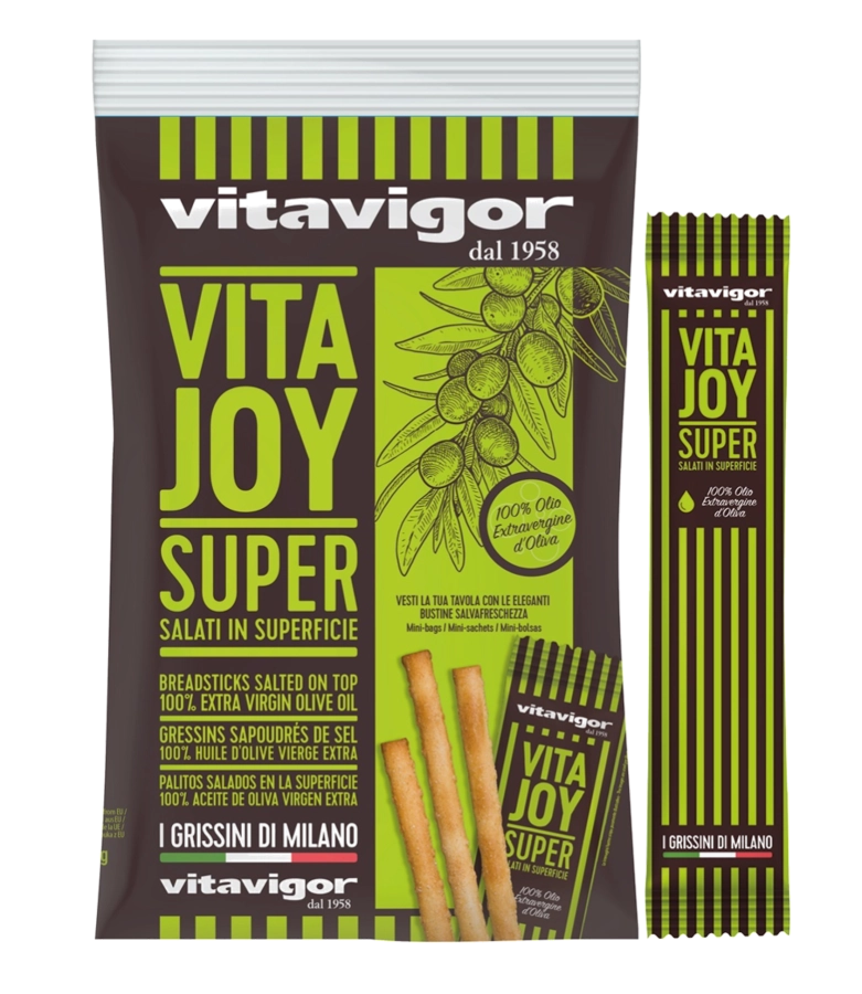 I SUPER grissini sono l'evoluzione del "Super Grissin de Milan"*. SUPER per la forma sinuosa ed elegante, SUPER per la fragranza con 6% di Olio Extravergine d’Oliva, SUPER per il gusto esaltato da una spruzzata di sale in superficie. *Prodotto inventato dal fondatore di Vitavigor. Le Fashion Bustine di grissini offrono un tocco di eleganza alla tavola dei ristoratori più esigenti e delle consumatrici più attente allo stile. I Super Grissini sono perfetti per accompagnare i pasti a casa e come spuntino spezzafme, e grazie alle comode monoporzioni sono ideali da portare in ufficio. Peso netto: 350g. Adatto per vegetariani.
