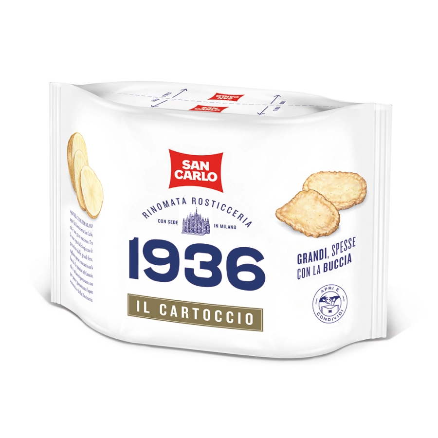 1936. L’ANTICA RICETTA SAN CARLO Questa è una storia vera, fatta di piaceri genuini e sapori buoni, di quando la cucina era un rito, lento e semplice, di quando la Rosticceria San Carlo apriva nel cuore di Milano diventando presto un punto di riferimento per i buongustai dell’epoca. Le patatine 1936 Antica Ricetta sono perfettamente dorate, arricciate e croccanti grazie alle patate di prima qualità e al girasole alto oleico che aiuta a conferire freschezza e leggerezza al prodotto. La cottura lenta ed eseguita a diverse temperature dona il sapore di una storia vera e della preparazione come una volta.