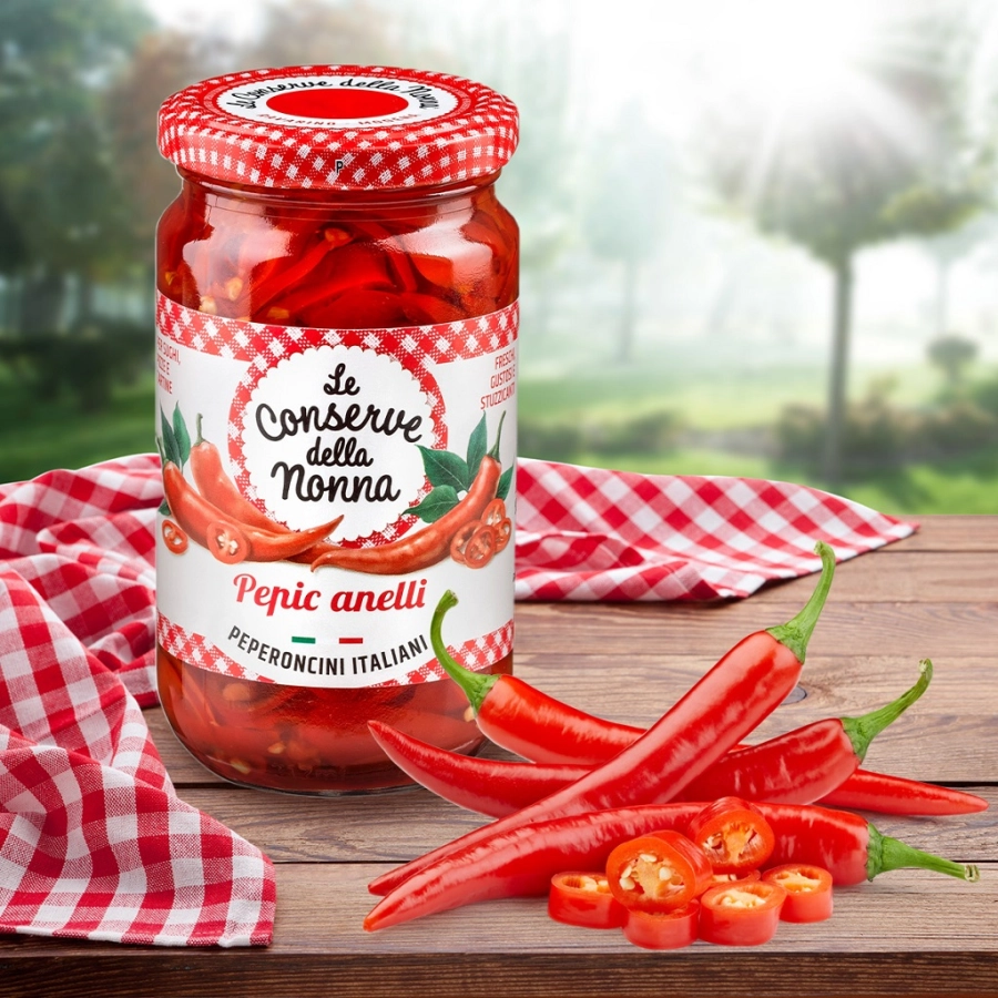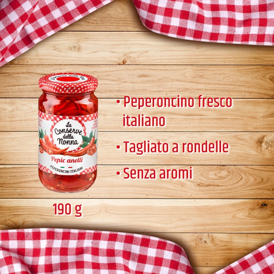 Peperoncini piccanti 100% italiani tagliati a rondelle e conservati in olio. Lavorati in stagione da prodotto fresco. Senza coloranti né conservanti. Da tenere sempre in dispensa per dare sapore a tutte le ricette