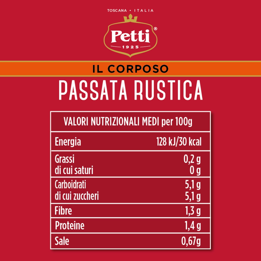 “Il Corposo” è ideale per tutte le ricette di veloce preparazione che richiedono un prodotto genuino in grado di esaltare anche i piatti più semplici. Particolarmente adatto a condire i piatti più tradizionali e la pasta ruvida. Dopo un’accurata selezione i migliori pomodori toscani vengono passati in un setaccio a trama grossa per garantire la miglior corposità. Si ottiene così una passata speciale, estremamente dolce e dal colore rosso brillante.