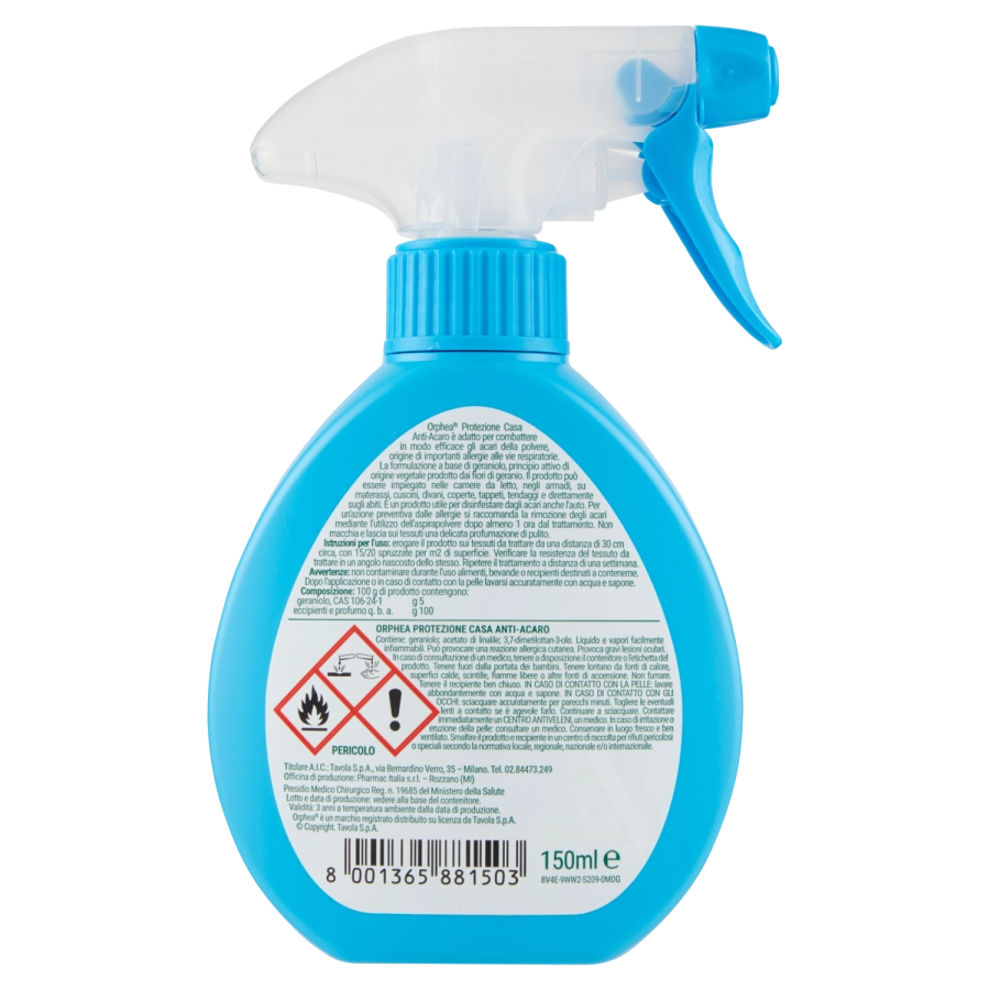 Istruzioni per l'uso: erogare il prodotto sui tessuti da trattare da una distanza di 30 cm circa, con 15/20 spruzzate per m2 di superficie. Verificare la resistenza del tessuto da trattare in un angolo nascosto dello stesso. Ripetere il trattamento a distanza di una settimana.; Avvertenze: non contaminare durante l'uso alimenti, bevande o recipienti destinati a contenerne. Dopo l'applicazione o in caso di contatto con la pelle lavarsi accuratamente con acqua e sapone. PERICOLO Orphea Protezione Casa Anti-Acaro Contiene: geraniolo; acetato di linalile; 3,7-dimetilottan-3-olo. Liquido e vapori facilmente infiammabili. Può provocare una reazione allergica cutanea. Provoca gravi lesioni oculari. In caso di consultazione di un medico, tenere a disposizione il contenitore o l'etichetta del prodotto. Tenere fuori dalla portata dei bambini. Tenere lontano da fonti di calore, superfici calde, scintille, fiamme libere o altre fonti di accensione. Non fumare. Tenere il recipiente ben chiuso. IN CASO DI CONTATTO CON LA PELLE: lavare abbondantemente con acqua e sapone. IN CASO DI CONTATTO CON GLI OCCHI: sciacquare accuratamente per parecchi minuti. Togliere le eventuali lenti a contatto se è agevole farlo. Continuare a sciacquare. Contattare immediatamente un CENTRO ANTIVELENI, un medico. In caso di irritazione o eruzione della pelle: consultare un medico. Conservare in luogo fresco e ben ventilato. Smaltire il prodotto e recipiente in un centro di raccolta per rifiuti pericolosi o speciali secondo la normativa locale, regionale, nazionale e/o internazionale. Presidio Medico Chirurgico - Reg. n. 19685 del Ministero della Salute