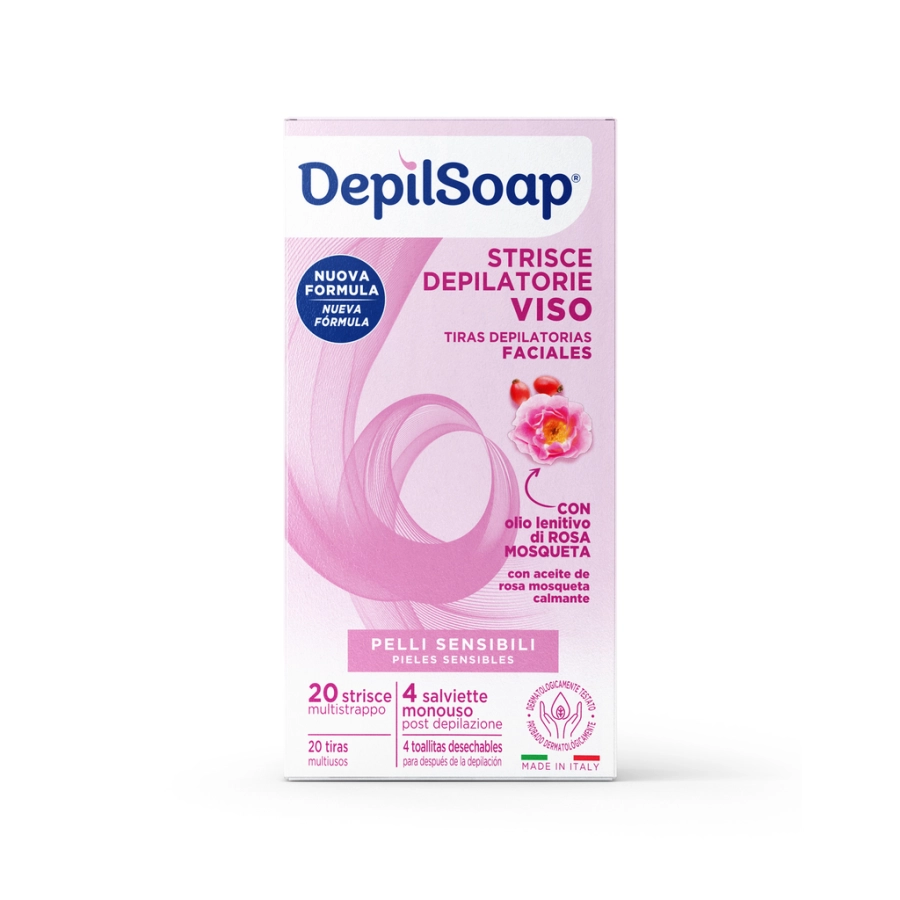 DepilSoap Strisce Depilatorie Viso per pelli sensibili eliminano efficacemente con un semplice gesto gli antiestetici baffetti e la peluria di altre parti del viso. La nuova formula è arricchita con Olio di Rosa Mosqueta e Burro di Karitè che contrastano l'insorgere di arrossamenti ed irritazioni grazie alle loro proprietà emollienti ed idratanti. Inoltre, la sua profumazione delicata dalle note fiorite, rende l'applicazione del prodotto ancora più piacevole. Le 4 salviettine post-depilazione contenute nella confezione rimuovono i residui di cera e svolgono un'azione emolliente e restitutiva dopo lo strappo grazie alla presenza di Olio di Jojoba e Burro di Cacao.