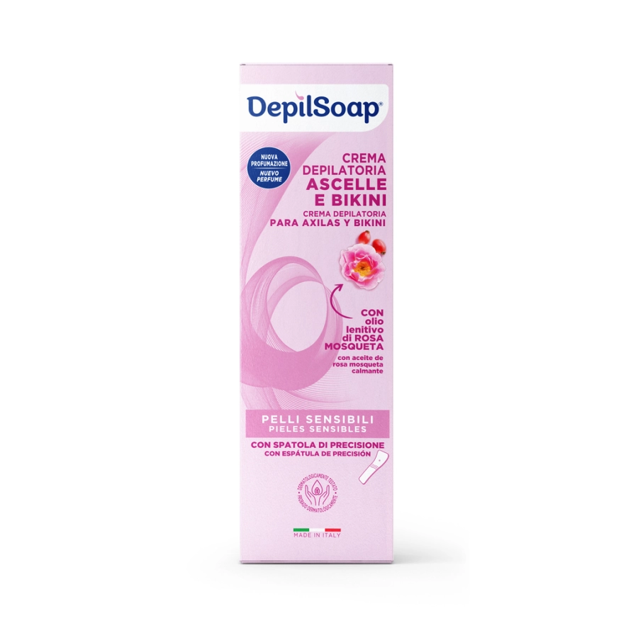 DepilSoap Crema Depilatoria per peli sensibili, pratica e facile da usare, agisce in pochi minuti eliminando efficacemente i pelli superflui nelle zone più delicate, come ascelle e bikini. La formulazione, senza ammoniaca, è arricchita con olio di Rosa Mosqueta e Acido Ialuronico che contrastano l'insorgere di arrossamenti ed irritazioni grazie alle loro proprietà lenitive ed idratanti. Inoltre, la sua profumazione delicata dalle note fiorite, rende l'applicazione del prodotto ancora più piacevole.