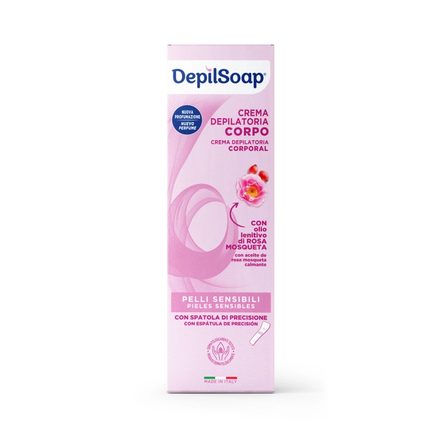 DepilSoap Crema Depilatoria per pelli sensibili, pratica e facile da usare, agisce in pochi minuti eliminando efficacemente i peli superflui. La formulazione, senza ammoniaca, è arricchita con olio di Rosa Mosqueta e Acido Ialuronico che contrastano l'insorgere di arrossamenti ed irritazioni grazie alle loro proprietà lenitive ed idratanti. Inoltre, la sua profumazione delicata dalle note fiorite, rende l'applicazione del prodotto ancora più piacevole.